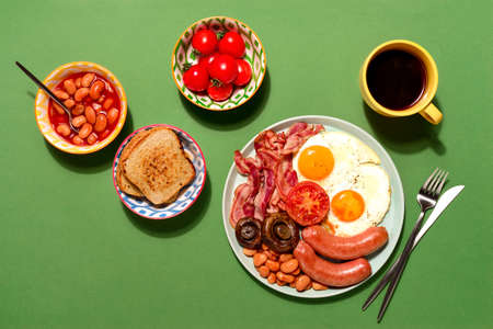 Traditional english breakfast with baked beans, sausages, bacon and sunny-side-up eggs on a green background. British full breakfast on a plate.