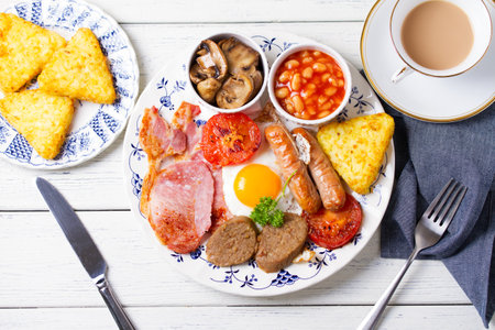 Full Irish or English breakfast with sausages, bacon, pudding, fried egg with runny yolk, hash browns, beans and tomatoes