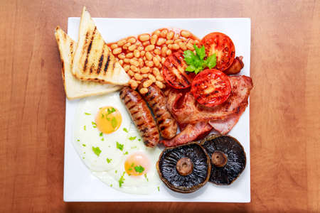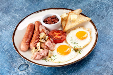 English Breakfast with fried eggs, sausages, bacon, beans, toasts and tomatos