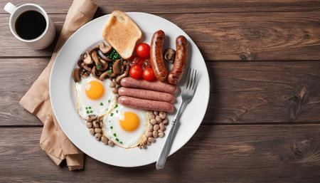 Full English breakfast with fried egg, bacon, sausage, beans and mushrooms on wooden background. Top view, flat lay