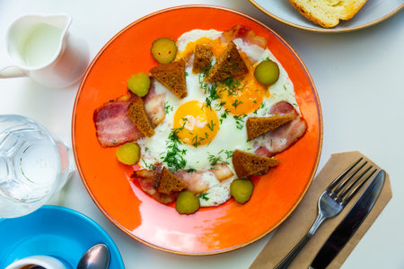 Fried eggs with bacon, croutons and pickles cucumber. Traditional breakfast