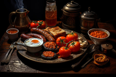 Full English breakfast with boiled eggs, beans, sausages, tomatoes, salt and spices on dark concrete background