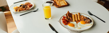Delicious breakfast with fried eggs, sausages and orange juice on table at home, banner