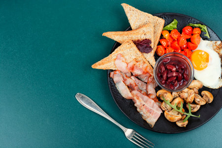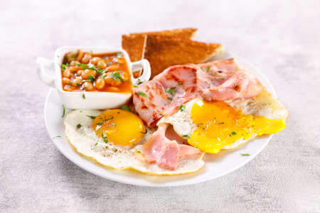 English breakfast on a plate with fried eggs, bacon, beans and toasts. Copy space.