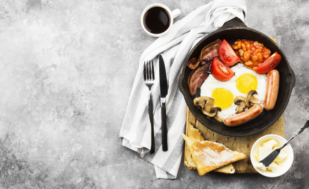 Full English Breakfast served in a pan. Fried eggs, beked beans, tomatoes, champignons, crispy bacon, sausages and toast. Placed on stone background. Top view with copy space.