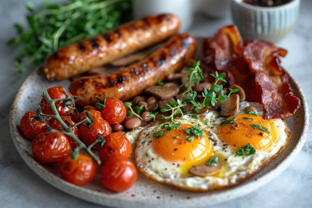 English breakfast with grilled sausages, fried egg, tomatoes and beans
