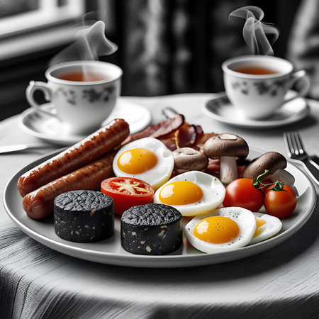Traditional irish breakfast with bacon, sausages, eggs, black pudding, and coffee.