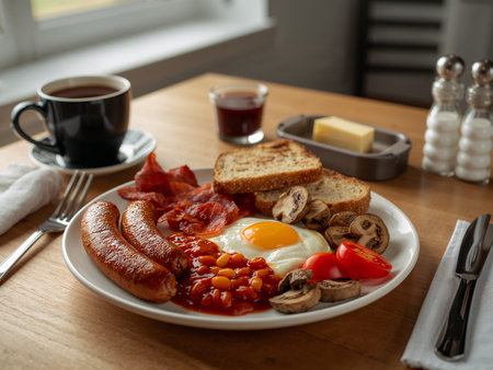 Full English breakfast with bacon, sausage, fried egg, baked beans and mushrooms.