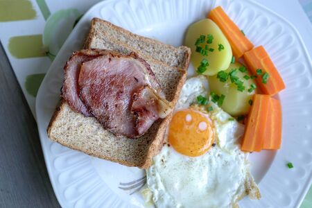 Breakfast with bacon, egg, potatoes, carrots and bread. Top view.