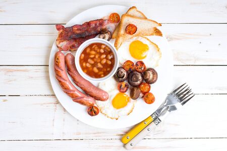 Full english breakfast with fried eggs, tomatoes, sausages, bacon, mushrooms, toasts and beans. Breakfast on a white plate with forks on the white wooden table. Top view