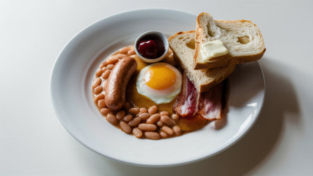 English breakfast: fried egg, bacon, beans and toast on a plate close-up. horizontal view from above
