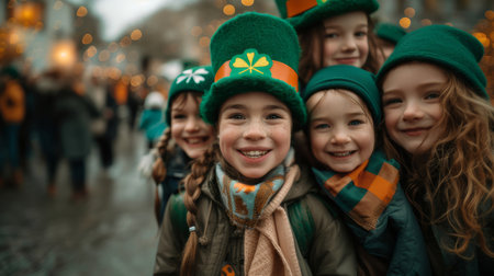 A group of happy children wearing green hats with clover motifs, celebrating St. Patrick's Day outdoors with a cheerful expression.