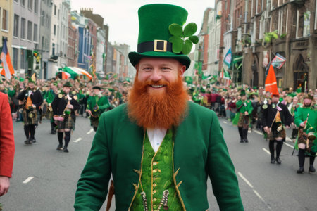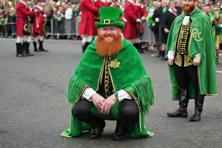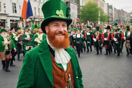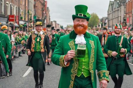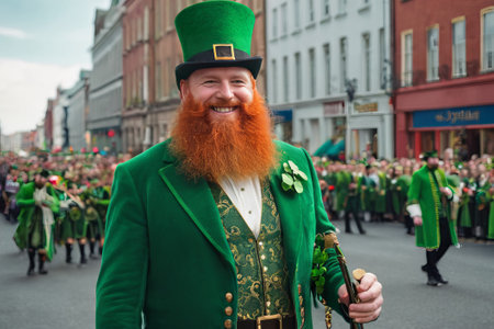 Ireland comes alive with a vibrant St. Patrick's Day parade. A man in a striking green suit, carrying a fiddle, adds musical charm to the festivities, embodying the spirit of the celebration