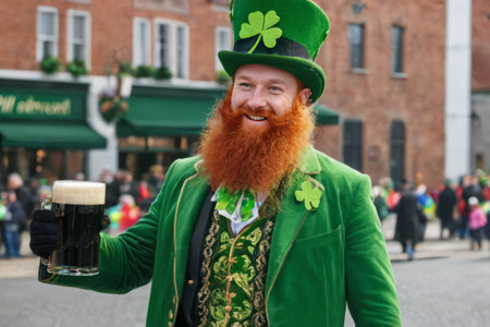 Smiling man with red beard wearing a green suit and top hat, showcasing joy and celebration against a dark background for festive occasions