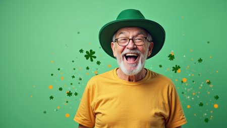 Elderly caucasian male celebrating with green hat and shamrocks.