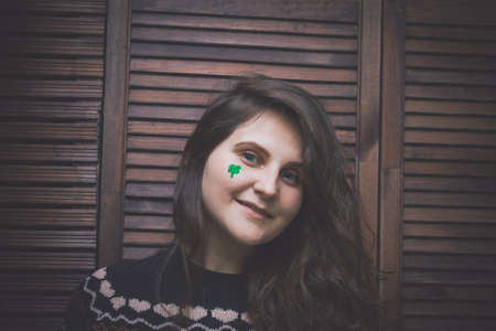 young beautiful woman with painted green clover on her cheek at the bar in front of a wooden wall