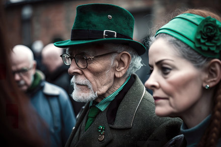 Family of Irish senior people dressed for celebration of St. Patricks Day on city street. 60yo Love story