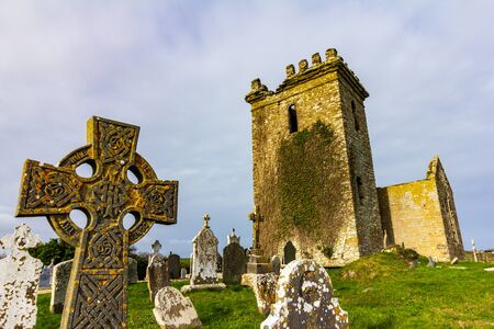 An ancient Christian cemetery in Ireland. Stone tombstones, Celtic cross. Christian cemetery