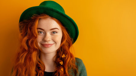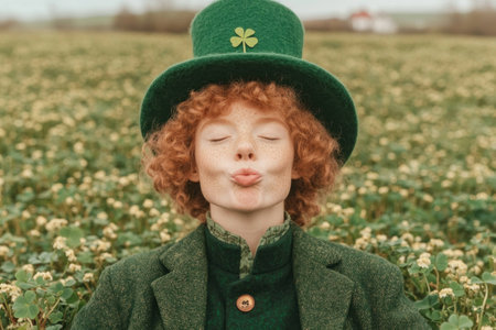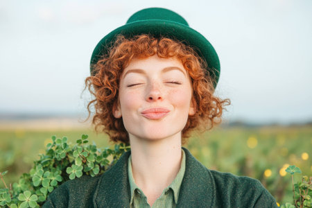 Joyful young redhead woman in a green hat and outfit, surrounded by clovers, celebrating St Patrick s Day in a vibrant outdoor setting