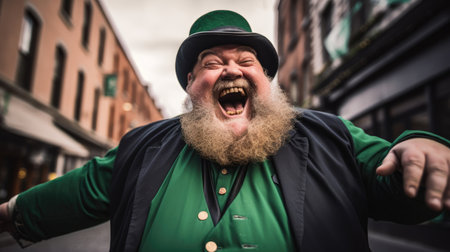 Happy St Patricks Day An Irishman in a green suit and hat is laughing.