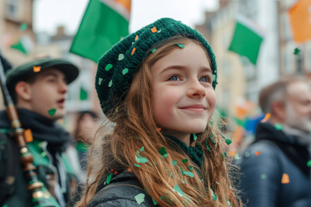 Happy young girl celebrating Saint Patrick's Day with green confetti in her hair