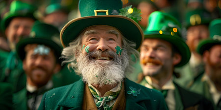 Close-up portrait of a cheerful elderly man with a green beard, celebrating Saint Patricks Day, conveying joy and festivity.
