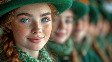 Beautiful young cheerful friends wearing green clothes and accessories participating in traditional Saint Patrick's Day parade in Irish town. Generative AI.