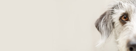 Closeup of the eye and face of a dog cropped on one side. Social Media or web banner with room for text