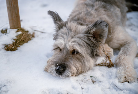 Close up portrait of fluffy dog lying on snow in winter day
