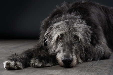 Scottish Deerhound lying down in black studio