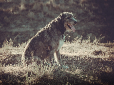 Irish Wolfhound. A big gray dog ​​sitting on the edge of a forest with high grass in front of him.