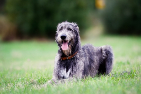 Gray Irish Wolfhound in a spring garden