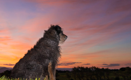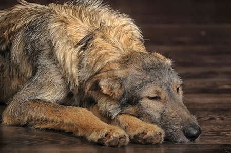 Big and thoughtful Wolfhound dog portrait over blurry background