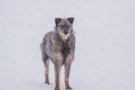 Frozen, homeless dog lies on the snow. Animals
