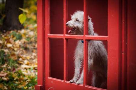 Little funny light dog with open mouth protrudes from an old red telephone box in the autumn park