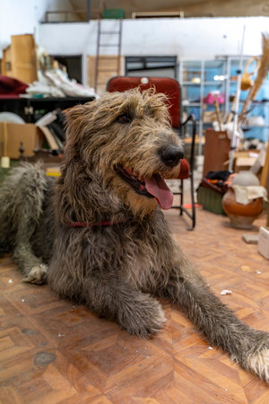Irish wolfhound dog lying down on a workshop floor, panting with its tongue out