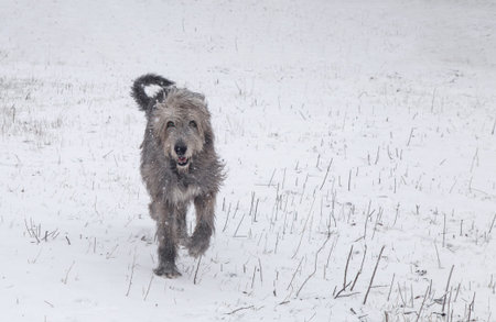 Large gray Irish wolfhound runs in the snow.