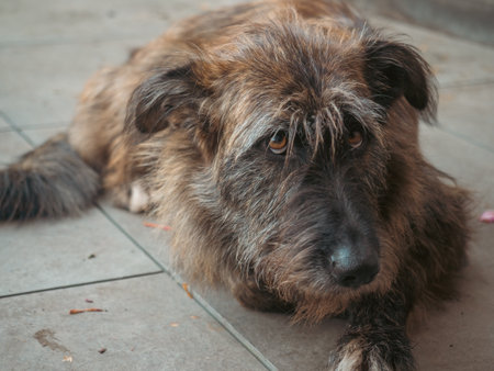 Shaggy Mixed Breed Dog with Dirty Muzzle Resting Outdoors During an Autumn Day with Falling Leaves
