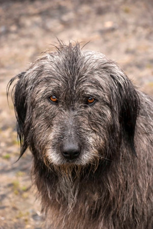 Alone homeless shaggy dog with a piercing eyes.
