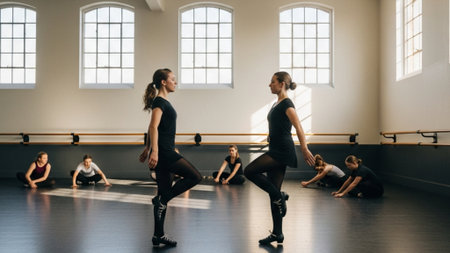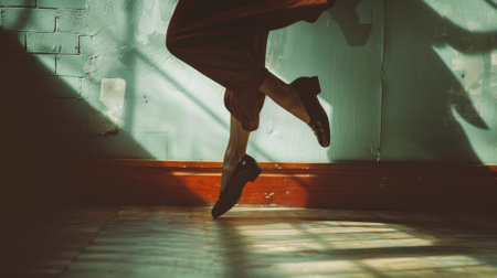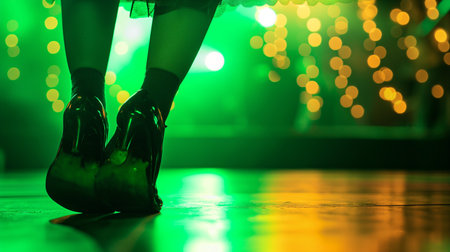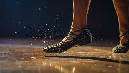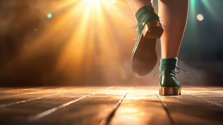 a close shot of tap shoes tapping on a brightly lit dance floor, created with generative ai