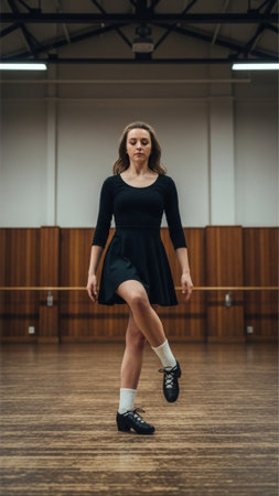 A striking vertical full-body shot of a single female Irish step dancer practicing advanced footwork