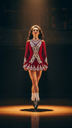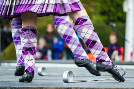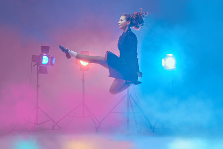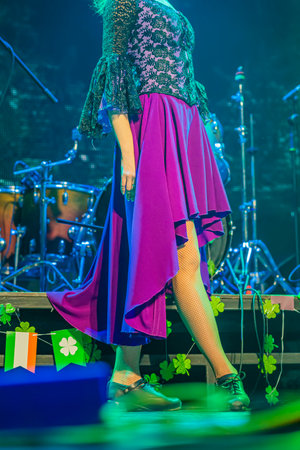Dancer in purple dress and fishnet stockings, bright stage lighting. Concept of Festive performance, traditional Irish music and dancing