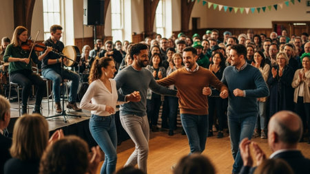 A cinematic wide shot capturing the full breadth of a lively indoor St. Patrick's Day community cele