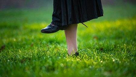 A whimsical moment captured as a person in a flowing black skirt and classic shoe dances lightly on a vibrant green lawn.