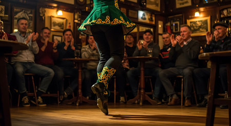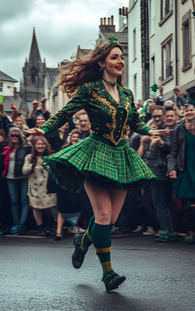 A vibrant scene from a St. Patrick's Day parade featuring Irish dancers in traditional green dresses and waistcoats. The dancers are performing intricate steps in the middle of the street, surrounded by a crowd of spectators. Green decorations and banners adorn the street, adding to the festive atmosphere.