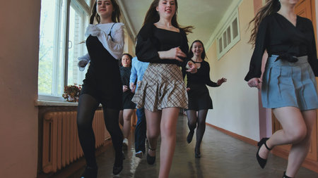 High school girls and teacher happily running in school hallway during break, cherishing their youth and friendship