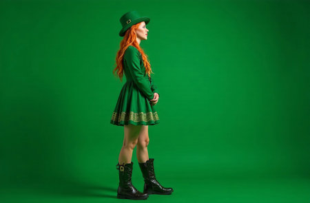 AI Generative Woman in traditional Irish green suit and hat stands on a green background. St. Patrick's Day Card
