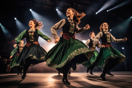 Young women in uniform dancing on stage in green skirts generated by artificial intelligence
