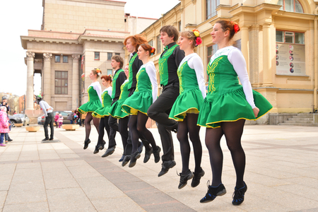 ST.PETERSBURG, RUSSIA - 9 APRIL 2017: Group of people in national costumes are dancing Irish dances on city street in the center of St. Petersburg.