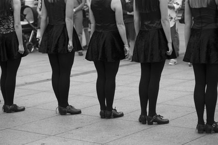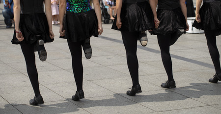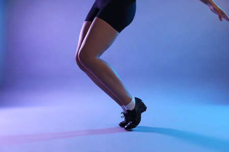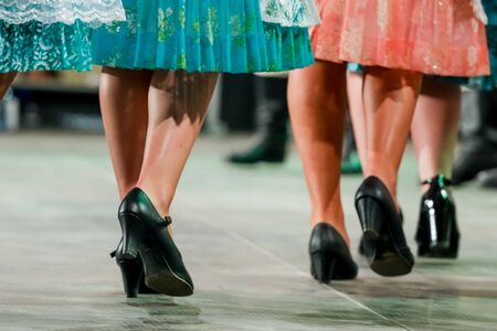 Close-up of female legs in black leather shoes dancing national Irish dances.
